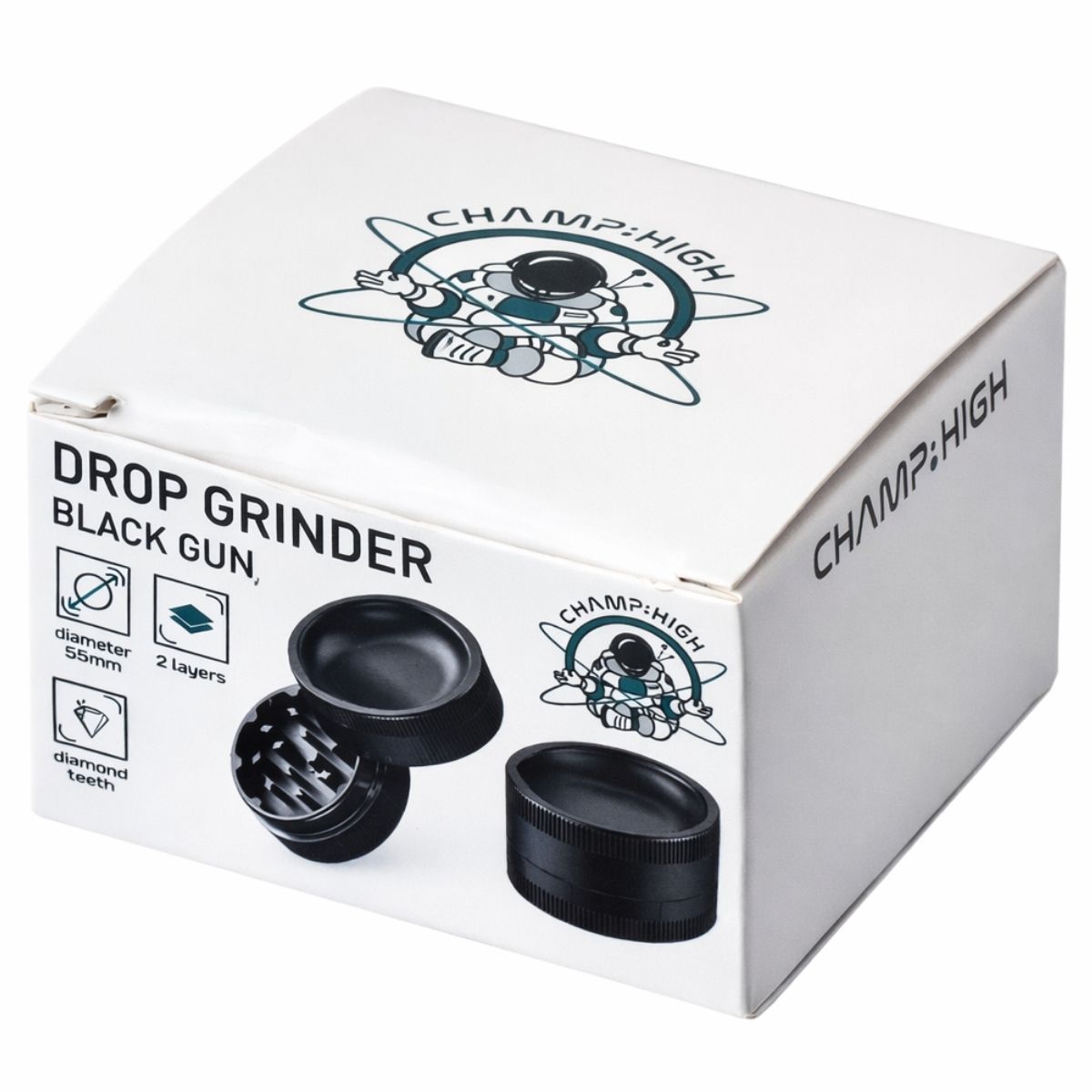 Construido completamente de metal y sin componentes electrónicos, el Black Gun Drop Grinder permite una amplia distribución en los mercados nacionales e internacionales donde se venden legalmente accesorios para fumar. Funciona bien como un artículo novedoso independiente o como parte de un surtido diversificado de grinders dirigido a ventas impulsadas por la exhibición.