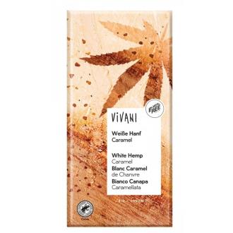Las semillas de cáñamo de este chocolate blanco están caramelizadas, de ahí su textura crujiente. BIO, plastic free y con certificación Rainforest.